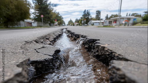 道路に亀裂が入り水道管が破裂して水が吹き出す