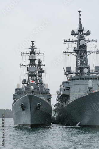 雨の公園から見える海上自衛隊の護衛艦