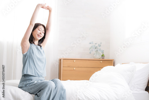 ベッドの上で寝起きで伸びやストレッチをする女性の動画の全身 よく寝た~と腕を伸ばす