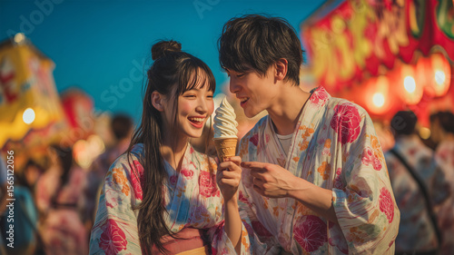 夏祭りでソフトクリームを分け合う日本人カップル