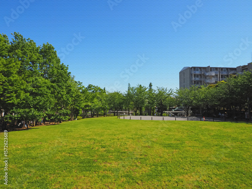東京の緑に包まれた芝生広場の風景。