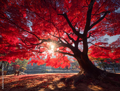 真っ赤に色づいた大きな紅葉の木と差し込む秋の陽光