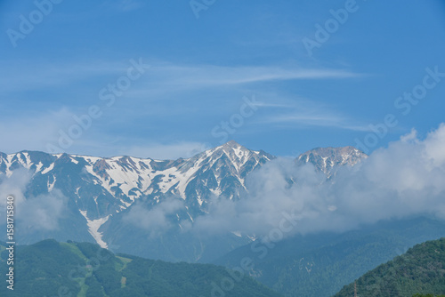 初夏の信州の風景 残雪残る白馬三山