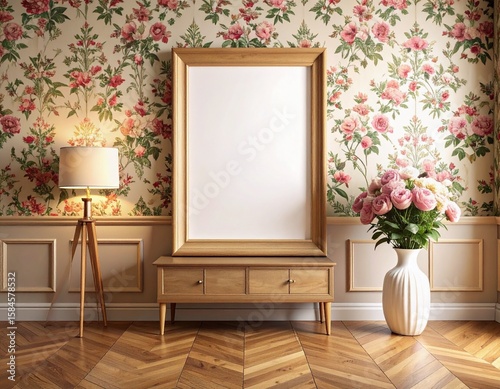 ヴィンテージ花柄壁紙のレトロな額縁モックアップ
