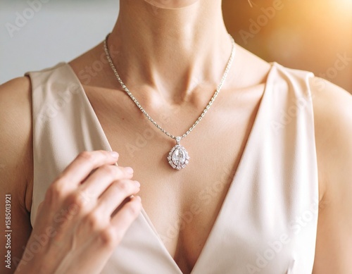 ネックレスを掛ける女性の首元
