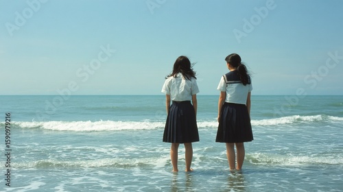 波打ち際に立つ二人の女子生徒の後ろ姿、友情と未来を象徴する広大な風景|学生, 友情, 海, 青春