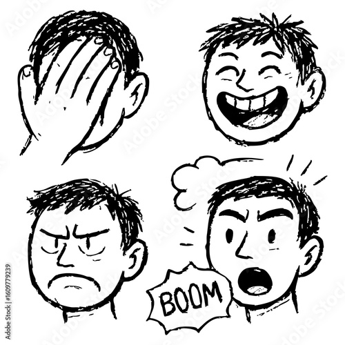 感情表現の手描きキャラクター 喜び 怒り 驚きの顔イラストセット