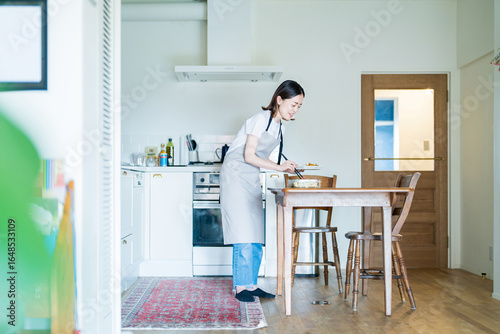 作り置きしたお惣菜をお皿に盛る女性