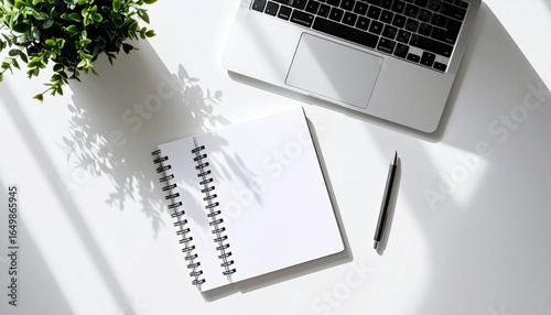スリムなラップトップ、ノート、ペンをモノクロデスクに配置したミニマルワークスペースのフラットレイ。