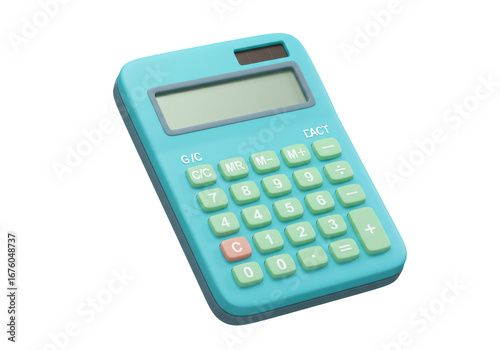 透明な背景にミントグリーンと白のボタンを備えたかわいい電卓のクローズアップ