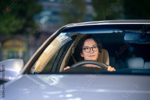 夜に車を運転する男性