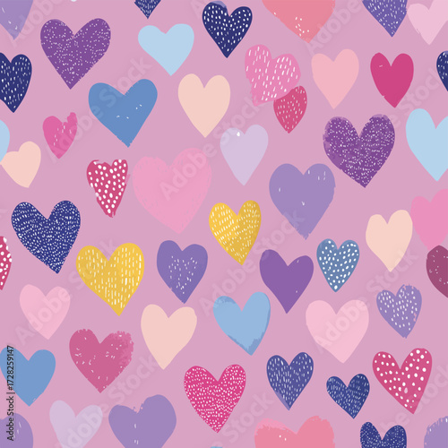 様々な色と質感のハートが散りばめられた、パステルカラーのシームレスパターンベクターイラスト。