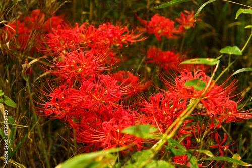 木陰で満開になった曼珠沙華を照らす太陽の光