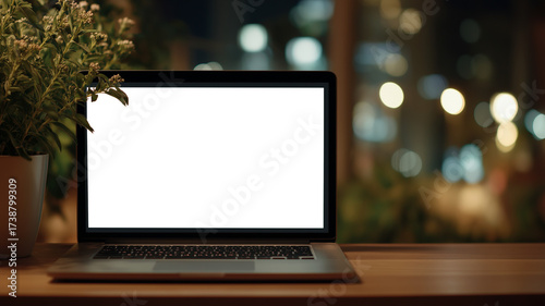 夜の静寂に包まれたシンプルな作業空間とノートパソコンのあるミニマルなデスク風景|夜景の光が差し込むシンプルインテリアとモダンな空間構成の抽象的イメージ