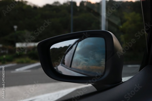 車のサイドミラーのクローズアップ。安全運転と視界確認のイメージ。