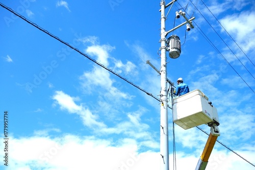 電柱の電気復旧工事をしている作業員