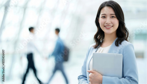 オフィス街の通路でパソコンを持ち微笑むビジネス女性