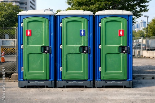 屋外イベント会場に設置された男女表示付き仮設トイレが整然と並ぶ公共設備イメージ