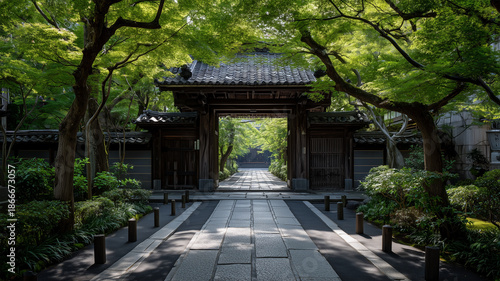 山門越しに新緑の参道が伸びる静かな寺社の風景