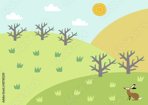 野兎と春の景色。風景。季節と自然のイラスト。素材。