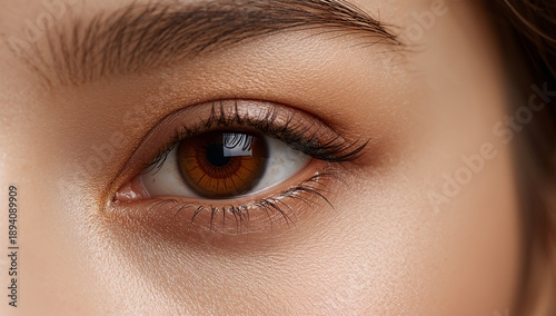 女性がダークブラウンの虹彩を上品に見せ、繊細な化粧で質感を際立てる
