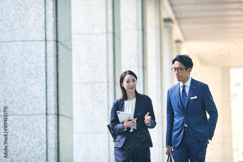 会話をしながら屋外を歩くビジネスマンとビジネスウーマン