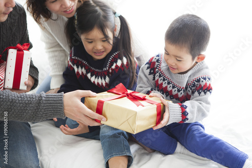 お父さんから、大きな箱のプレゼントをもらった男の子。