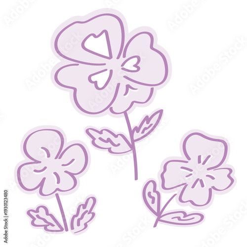 パープルのパンジーのポップな線画のステッカー風イラストセット