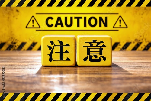黄色い背景の注意喚起ボードの前に置かれた注意という漢字が書かれた木製のサイコロ