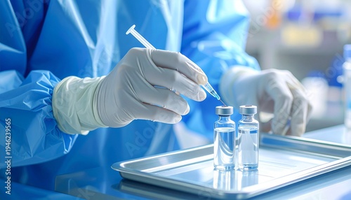無菌トレイの上で注射器と薬瓶を準備する日本人看護師の手元を捉えたクローズアップ医療シーン。