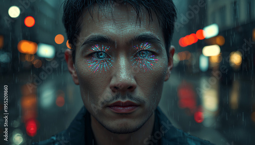 雨の街を万華鏡のような目で美しく歪ませる東アジア系男性三十代の肖像