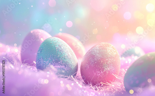 パステルカラーのカラフルなイースターエッグとキラキラ背景の春のイベント素材