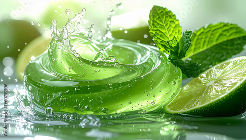 爽やかなライムとフレッシュミントが弾けるグリーンのジェルスプラッシュ、美容・スキンケアのイメージ