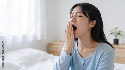 朝の寝室であくびをする日本人女性を写した生活写真
