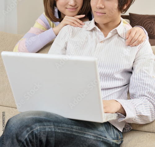 ソファに座ってパソコンを見る若いカップル