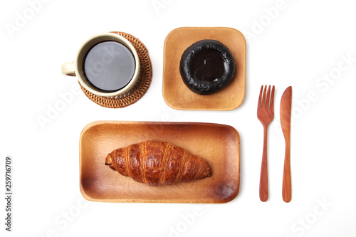 クロワッサン フランスのパン ホットコーヒー チョコレートケーキ 白背景