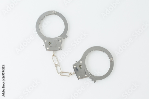 白背景におもちゃの手錠掴める警察犯人ドラマ