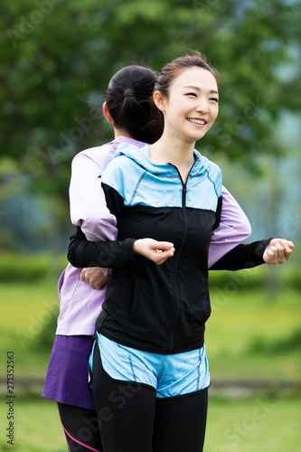 people, japan, japanese, asian, open air, woman, woman, adult, youth, youth, 30s, two people, beauty, clean, friends, friends, park, green, plant, leggings, sneak, hoodie, warmup, exercise, stretching, stretch, conversation, speaking, diet, sport, fitness, exercise, health, black hair, brown-haired, ponytail, smile, back