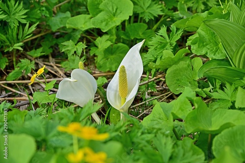 ミヤマキンポウゲ咲く湿原のミズバショウ@大雪山、北海道