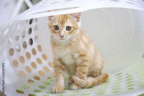 ランドリー籠の中でお座り子猫