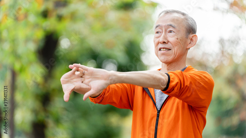 公園でストレッチをするシニア男性