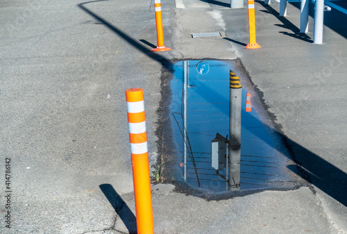 歩道に設置された車線分離標ポールコーンの写真