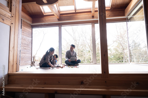 木造のきれいな新築の広い部屋で美人なママと家族団らんの幸せな若いファミリー 下にコピースペースあり