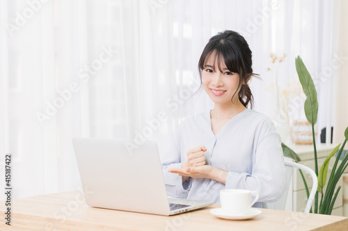部屋でノートパソコンを使いながら納得のジェスチャーをする若い女性
