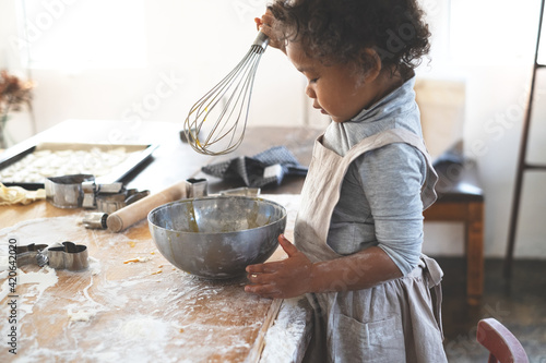 お菓子作りで泡立て器で生地を混ぜる女の子