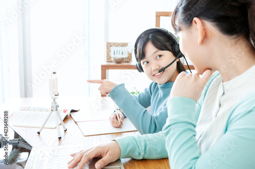 リモート授業を受ける女の子とパソコンをする母親