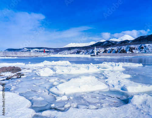 北海道 斜里町 流氷と宇登呂港に知床連山
