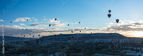 トルコ カッパドキアの早朝のギョレメ国立公園の空を飛ぶ熱気球