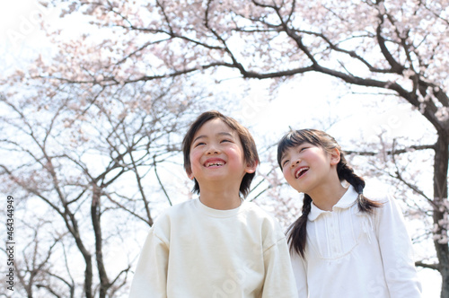 桜と子供のカップル