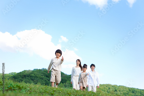 笑顔で歩いている男の子とその家族